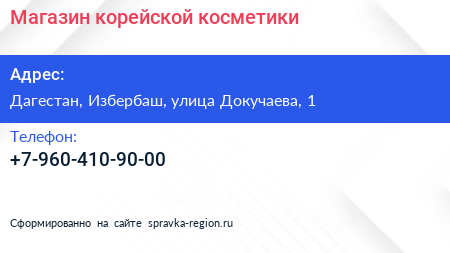 Магазин корейской косметики по адресу Дагестан, Избербаш, улица Докучаева, 1 в дальнейшем Организация, размещена в следующих категориях: