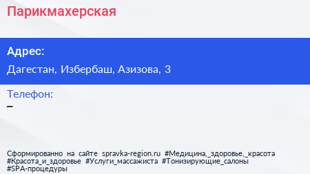 Парикмахерская по адресу Дагестан, Избербаш, Азизова, 3 в дальнейшем Организация, размещена в следующих категориях:
