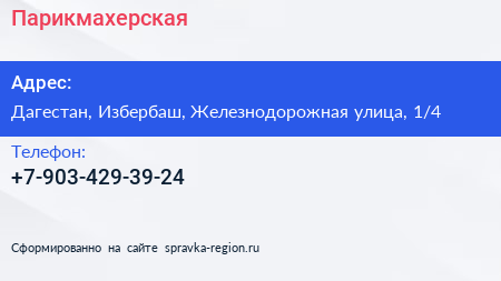 Парикмахерская по адресу Дагестан, Избербаш, Железнодорожная улица, 1/4 в дальнейшем Организация, размещена в следующих категориях: