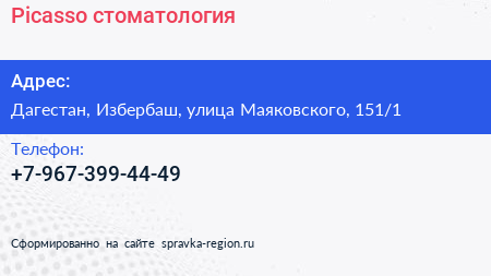 Picasso, стоматология по адресу Дагестан, Избербаш, улица Маяковского, 151/1 в дальнейшем Организация, размещена в следующих категориях: