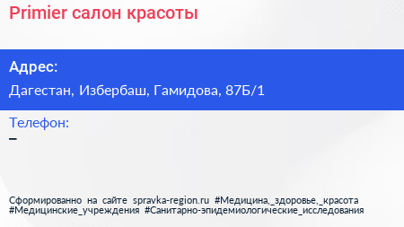 Primier, салон красоты по адресу Дагестан, Избербаш, Гамидова, 87Б/1 в дальнейшем Организация, размещена в следующих категориях: