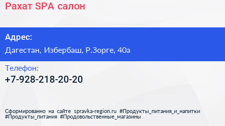 Рахат, SPA-салон по адресу Дагестан, Избербаш, Р.Зорге, 40а в дальнейшем Организация, размещена в следующих категориях: