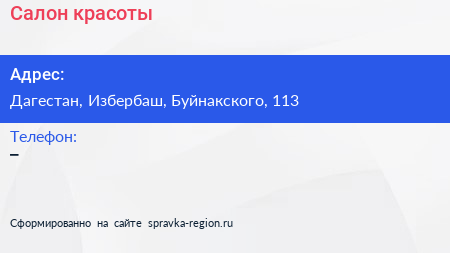 Салон красоты по адресу Дагестан, Избербаш, Буйнакского, 113 в дальнейшем Организация, размещена в следующих категориях: