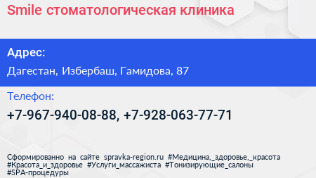 Smile, стоматологическая клиника по адресу Дагестан, Избербаш, Гамидова, 87 в дальнейшем Организация, размещена в следующих категориях: