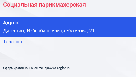 Социальная парикмахерская по адресу Дагестан, Избербаш, улица Кутузова, 21 в дальнейшем Организация, размещена в следующих категориях: