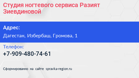 Студия ногтевого сервиса Разият Зиевдиновой по адресу Дагестан, Избербаш, Громова, 1 в дальнейшем Организация, размещена в следующих категориях: