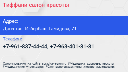 Тиффани, салон красоты по адресу Дагестан, Избербаш, Гамидова, 71 в дальнейшем Организация, размещена в следующих категориях: