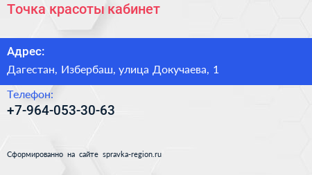 Точка красоты, кабинет по адресу Дагестан, Избербаш, улица Докучаева, 1 в дальнейшем Организация, размещена в следующих категориях: