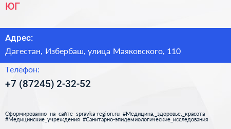 ЮГ по адресу Дагестан, Избербаш, улица Маяковского, 110 в дальнейшем Организация, размещена в следующих категориях: