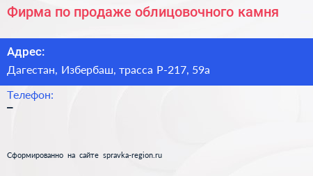 Фирма по продаже облицовочного камня по адресу Дагестан, Избербаш, трасса Р-217, 59а в дальнейшем Организация, размещена в следующих категориях: