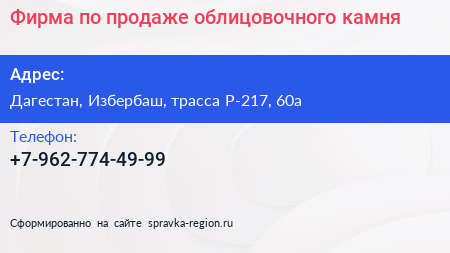 Фирма по продаже облицовочного камня по адресу Дагестан, Избербаш, трасса Р-217, 60а в дальнейшем Организация, размещена в следующих категориях: