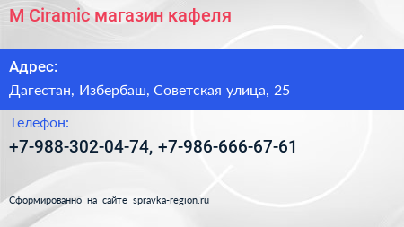 M Ciramic, магазин кафеля по адресу Дагестан, Избербаш, Советская улица, 25 в дальнейшем Организация, размещена в следующих категориях: