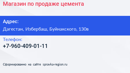 Магазин по продаже цемента по адресу Дагестан, Избербаш, Буйнакского, 130в в дальнейшем Организация, размещена в следующих категориях: