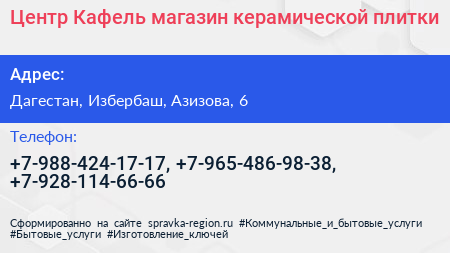 Центр Кафель, магазин керамической плитки по адресу Дагестан, Избербаш, Азизова, 6 в дальнейшем Организация, размещена в следующих категориях: