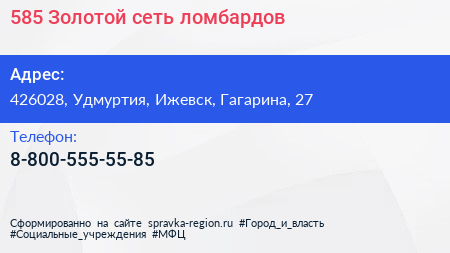 585*Золотой, сеть ломбардов по адресу 426028, Удмуртия, Ижевск, Гагарина, 27 в дальнейшем Организация, размещена в следующих категориях: