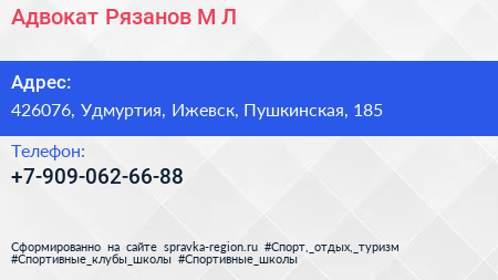 Адвокат Рязанов М.Л. по адресу 426076, Удмуртия, Ижевск, Пушкинская, 185 в дальнейшем Организация, размещена в следующих категориях:
