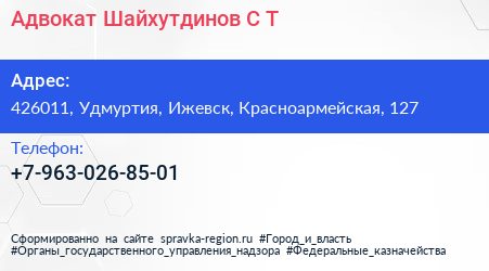 Адвокат Шайхутдинов С.Т. по адресу 426011, Удмуртия, Ижевск, Красноармейская, 127 в дальнейшем Организация, размещена в следующих категориях: