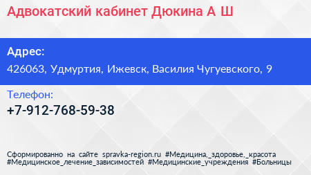 Адвокатский кабинет Дюкина А.Ш. по адресу 426063, Удмуртия, Ижевск, Василия Чугуевского, 9 в дальнейшем Организация, размещена в следующих категориях: