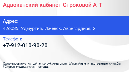 Адвокатский кабинет Строковой А.Т. по адресу 426035, Удмуртия, Ижевск, Авангардная, 2 в дальнейшем Организация, размещена в следующих категориях: