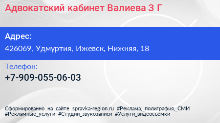 Адвокатский кабинет Валиева З.Г. по адресу 426069, Удмуртия, Ижевск, Нижняя, 18 в дальнейшем Организация, размещена в следующих категориях: