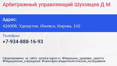 Арбитражный управляющий Шуховцев Д.М. по адресу 426008, Удмуртия, Ижевск, Кирова, 142 в дальнейшем Организация, размещена в следующих категориях: