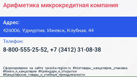 Арифметика, микрокредитная компания по адресу 426006, Удмуртия, Ижевск, Клубная, 44 в дальнейшем Организация, размещена в следующих категориях: