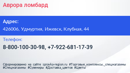 Аврора, ломбард по адресу 426006, Удмуртия, Ижевск, Клубная, 44 в дальнейшем Организация, размещена в следующих категориях: