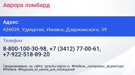 Аврора, ломбард по адресу 426039, Удмуртия, Ижевск, Дзержинского, 59 в дальнейшем Организация, размещена в следующих категориях:
