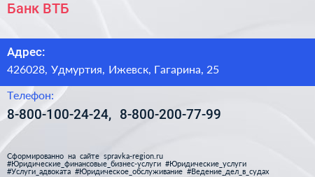Банк ВТБ по адресу 426028, Удмуртия, Ижевск, Гагарина, 25 в дальнейшем Организация, размещена в следующих категориях: