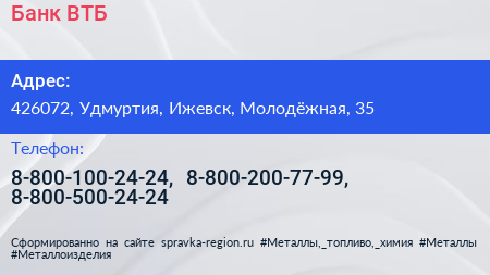 Банк ВТБ по адресу 426072, Удмуртия, Ижевск, Молодёжная, 35 в дальнейшем Организация, размещена в следующих категориях: