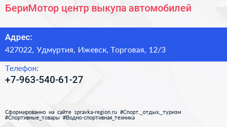 БериМотор, центр выкупа автомобилей по адресу 427022, Удмуртия, Ижевск, Торговая, 12/3 в дальнейшем Организация, размещена в следующих категориях: