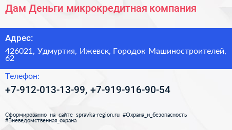 Дам Деньги, микрокредитная компания по адресу 426021, Удмуртия, Ижевск, Городок Машиностроителей, 62 в дальнейшем Организация, размещена в следующих категориях:
