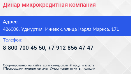 Динар, микрокредитная компания по адресу 426008, Удмуртия, Ижевск, улица Карла Маркса, 171 в дальнейшем Организация, размещена в следующих категориях: