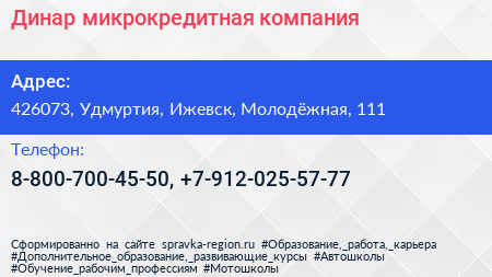 Динар, микрокредитная компания по адресу 426073, Удмуртия, Ижевск, Молодёжная, 111 в дальнейшем Организация, размещена в следующих категориях:
