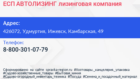 ЕСП АВТОЛИЗИНГ, лизинговая компания по адресу 426072, Удмуртия, Ижевск, Камбарская, 49 в дальнейшем Организация, размещена в следующих категориях: