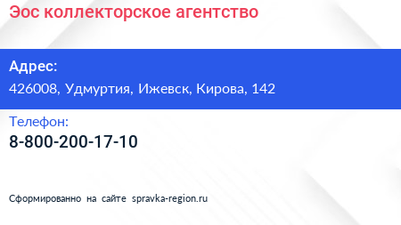 Эос, коллекторское агентство по адресу 426008, Удмуртия, Ижевск, Кирова, 142 в дальнейшем Организация, размещена в следующих категориях: