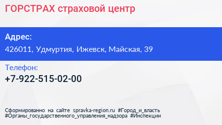 ГОРСТРАХ, страховой центр по адресу 426011, Удмуртия, Ижевск, Майская, 39 в дальнейшем Организация, размещена в следующих категориях: