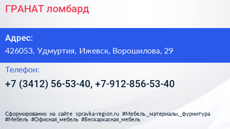 ГРАНАТ, ломбард по адресу 426053, Удмуртия, Ижевск, Ворошилова, 29 в дальнейшем Организация, размещена в следующих категориях: