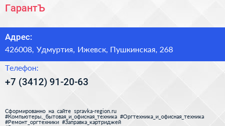 ГарантЪ по адресу 426008, Удмуртия, Ижевск, Пушкинская, 268 в дальнейшем Организация, размещена в следующих категориях: