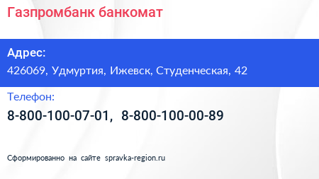 Газпромбанк, банкомат по адресу 426069, Удмуртия, Ижевск, Студенческая, 42 в дальнейшем Организация, размещена в следующих категориях:
