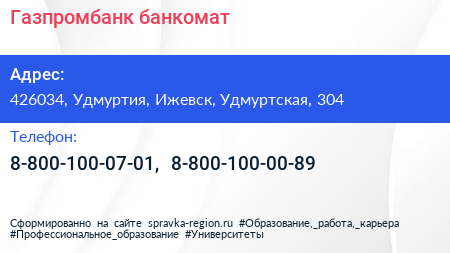 Газпромбанк, банкомат по адресу 426034, Удмуртия, Ижевск, Удмуртская, 304 в дальнейшем Организация, размещена в следующих категориях: