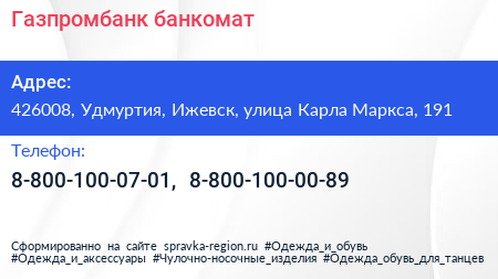 Газпромбанк, банкомат по адресу 426008, Удмуртия, Ижевск, улица Карла Маркса, 191 в дальнейшем Организация, размещена в следующих категориях: