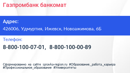 Газпромбанк, банкомат по адресу 426006, Удмуртия, Ижевск, Новоажимова, 6Б в дальнейшем Организация, размещена в следующих категориях: