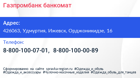 Газпромбанк, банкомат по адресу 426063, Удмуртия, Ижевск, Орджоникидзе, 16 в дальнейшем Организация, размещена в следующих категориях: