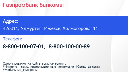 Газпромбанк, банкомат по адресу 426011, Удмуртия, Ижевск, Холмогорова, 11 в дальнейшем Организация, размещена в следующих категориях: