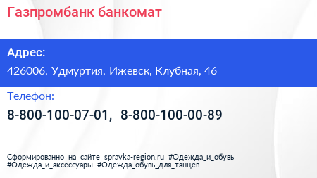 Газпромбанк, банкомат по адресу 426006, Удмуртия, Ижевск, Клубная, 46 в дальнейшем Организация, размещена в следующих категориях: