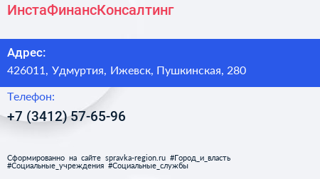 ИнстаФинансКонсалтинг по адресу 426011, Удмуртия, Ижевск, Пушкинская, 280 в дальнейшем Организация, размещена в следующих категориях: