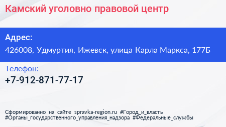 Камский уголовно-правовой центр по адресу 426008, Удмуртия, Ижевск, улица Карла Маркса, 177Б в дальнейшем Организация, размещена в следующих категориях: