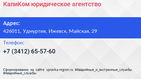 КапиКом, юридическое агентство по адресу 426011, Удмуртия, Ижевск, Майская, 29 в дальнейшем Организация, размещена в следующих категориях: