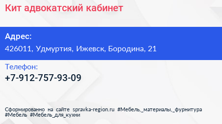 Кит, адвокатский кабинет по адресу 426011, Удмуртия, Ижевск, Бородина, 21 в дальнейшем Организация, размещена в следующих категориях: